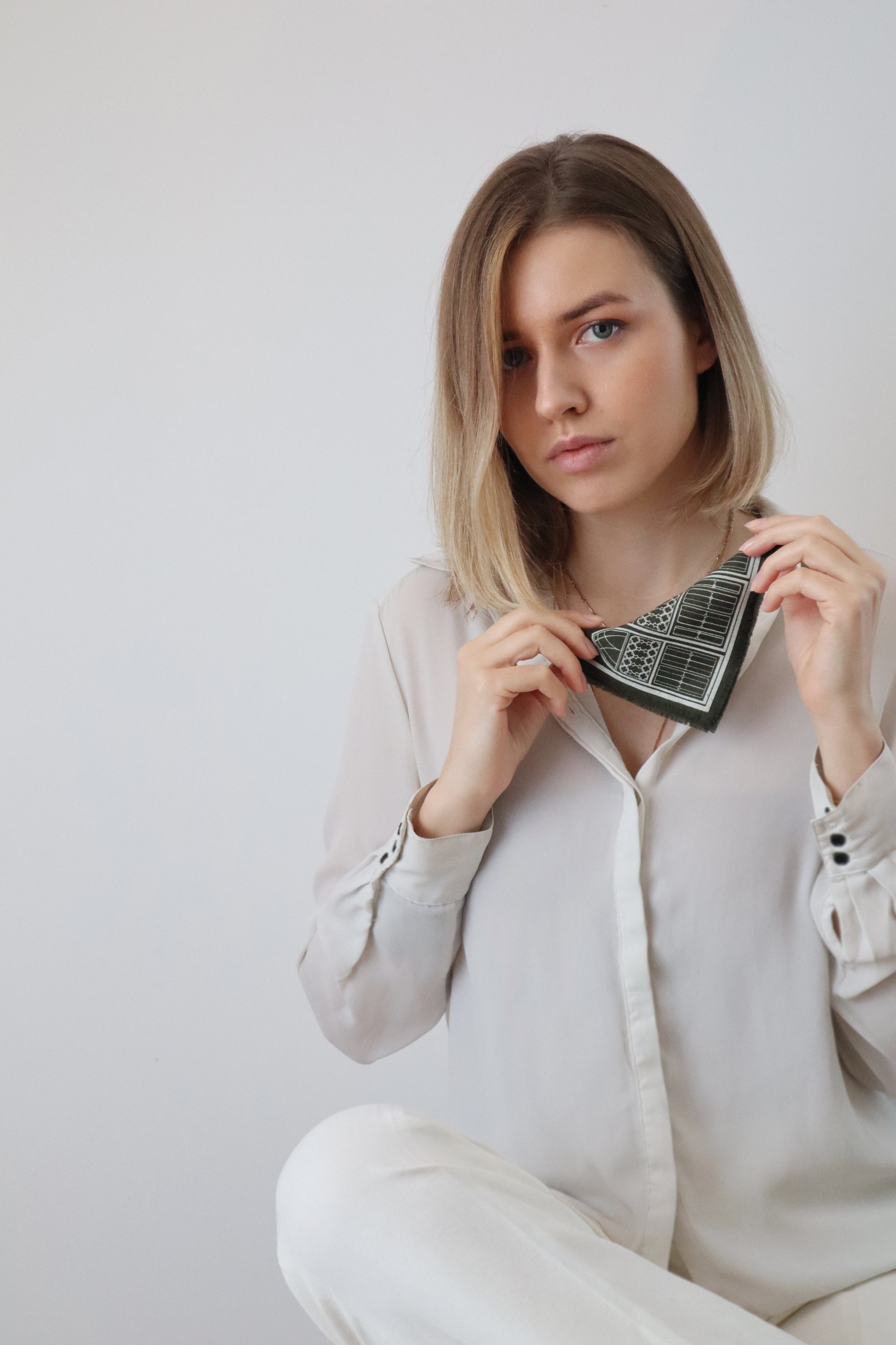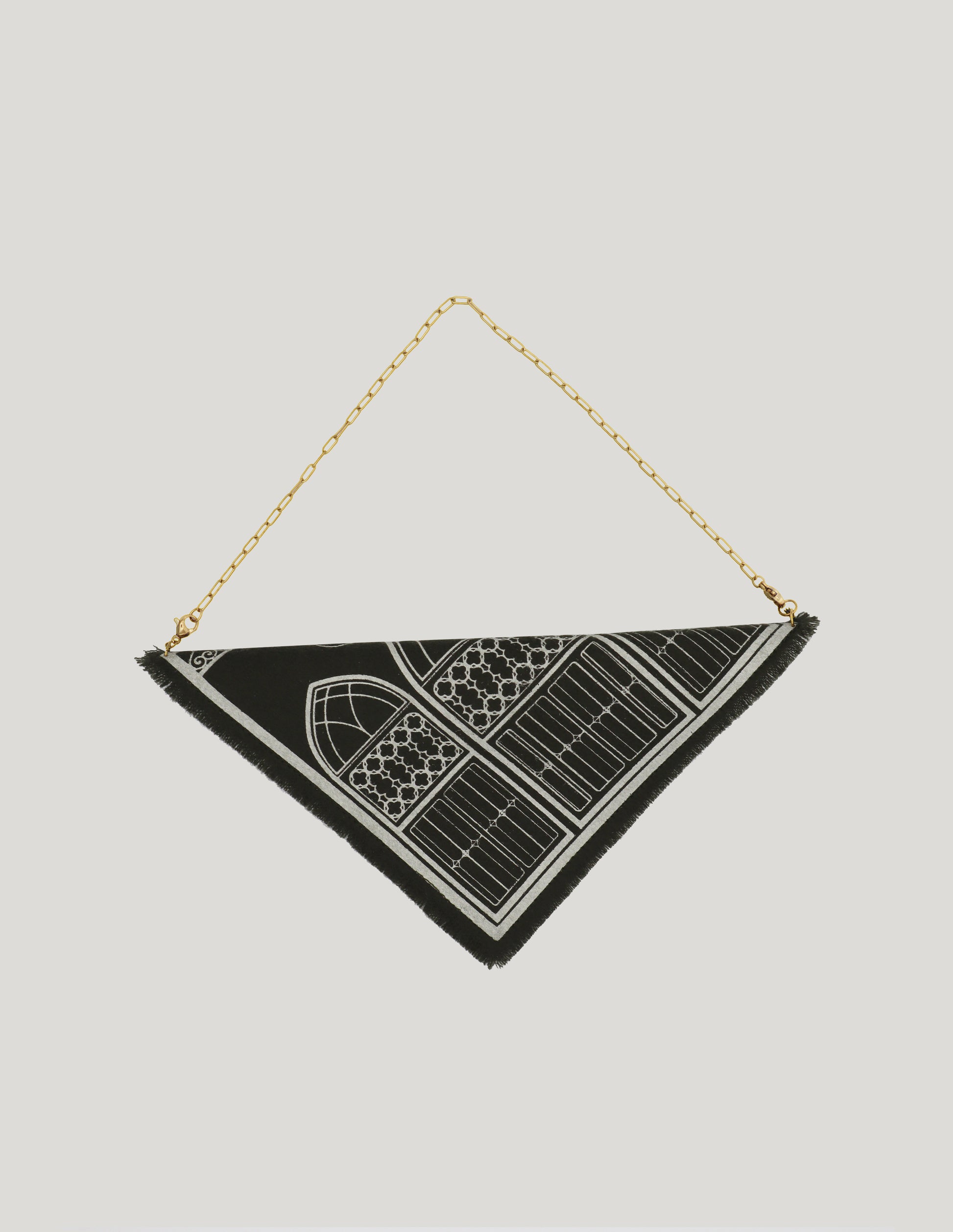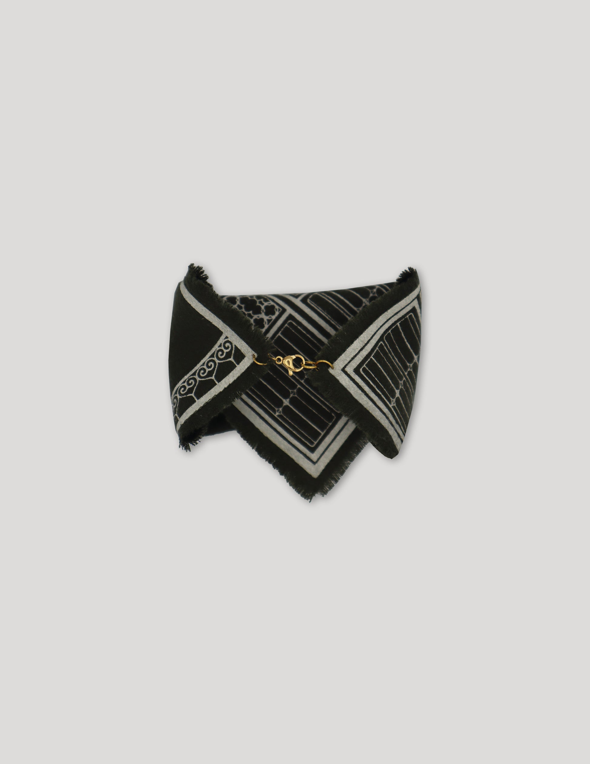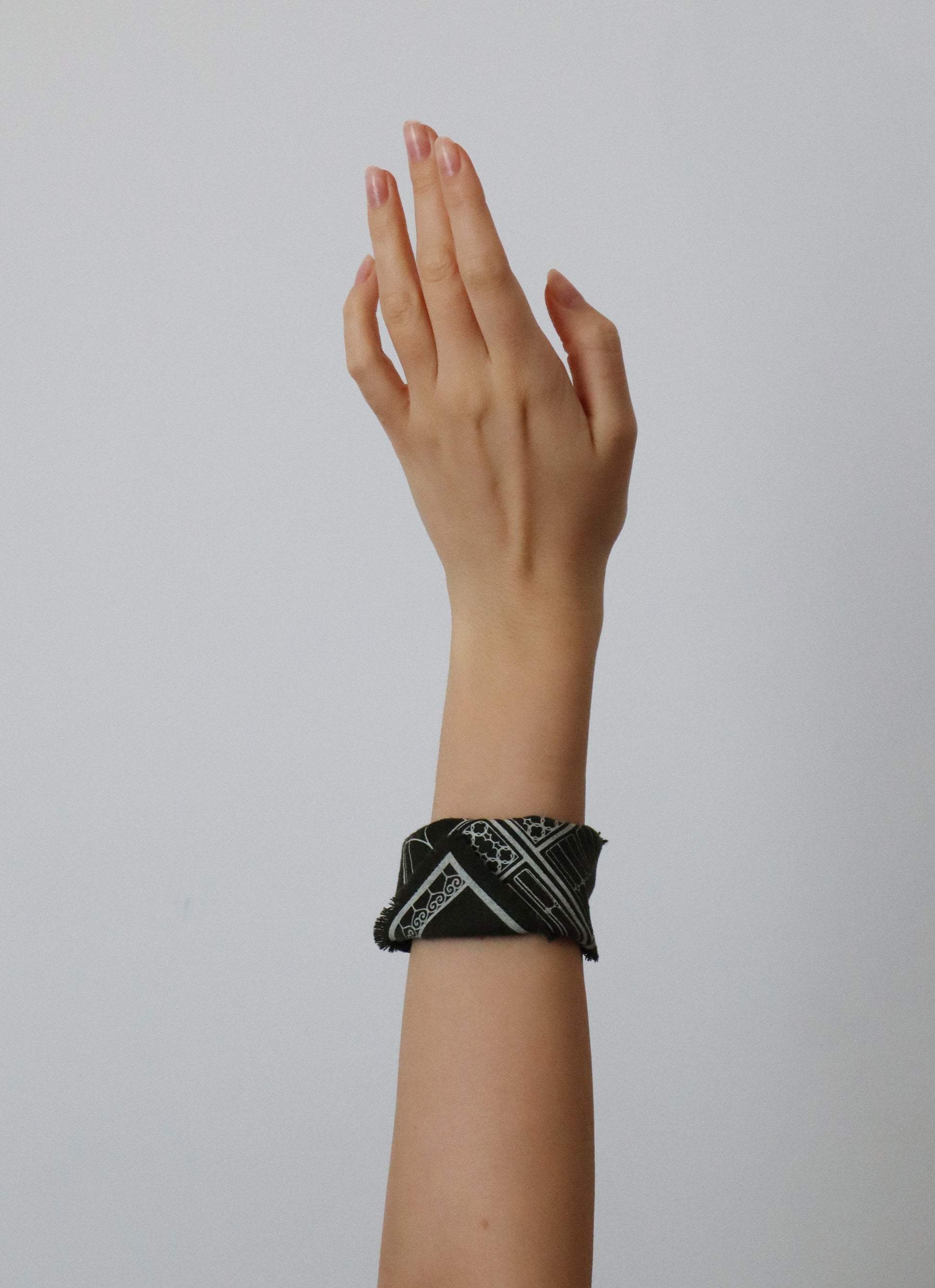 • Motifs imprimés au pochoir avec bords frangés à la main.